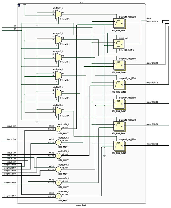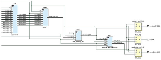 The high-level block diagram shown in Figure 11 illustrates the general layout and operation of the hardware CNN. The FPGA is fed three 3 × 1 input values from the binary images, which are used as inputs for the parallelized convolution process. The kernel weights are stored in separate BRAMs and are updated after a single pass from the MAC operations to the softmax classification result. The hardware synthesis schematic diagrams shown in Figure 12 and Figure 13 demonstrate how the high-level diagram was translated to produce a functional solution, while Figure 11 shows that the values passed into the FPGA via SPI are fed into three kernel BRAMS. These contain the weights of the filters used in the convolution layer. They are multiplied by the SPI input and the kernel weight values. The results are sent to the adder/activation map generator. The block performs the calculation of the batch normalization of values after the map is fully populated to 38 × 38 matrices as explained in Section 3.