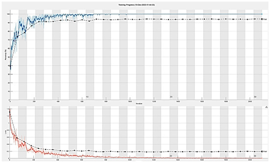 The custom CNN model was trained on 4587 images, with 1378 images used for testing and 937 for validation in MATLAB. The parameters set for the training process were as follows: a maximum of 30 epochs, 70 iterations per epoch, and a maximum of 2100 iterations. The learning rate was set to 0.001, and the GPU used was an NVIDIA K80. The training accuracy progress is shown in Figure 15, and the final validation accuracy of 94.07% is presented in Figure 16.