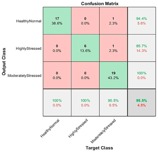 Confusion matrices were generated for the MATLAB implementation, including all three classes. Figure 17 presents the results from a smaller unseen test dataset consisting of 18 normal images, 19 moderately stressed images, and 7 highly stressed images. The MATLAB model achieved an overall accuracy of 94.07%, with its weakest classification performance observed in distinguishing between moderately stressed and normal images, as well as highly stressed images, as shown in Figure 17.