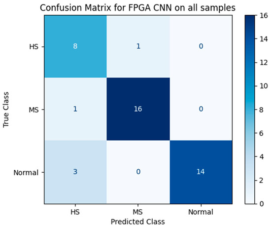 Figure 18 shows a confusion matrix generated from the results of the FPGA’s custom CNN. These matrices were compiled based on classifications between two categories at a time. Darker sections of the matrices represent higher percentage values between the two categories, while lighter sections indicate lower percentage values. The FPGA CNN model demonstrates a stronger capability to differentiate between normal samples and both moderately and highly stressed samples. However, it is less effective at distinguishing between moderately stressed and highly stressed samples. When combining all confusion matrices, the classification accuracy for unseen images is approximately 91%. Each test case was evaluated with the same unseen test dataset used for the MATLAB CNN implementation.