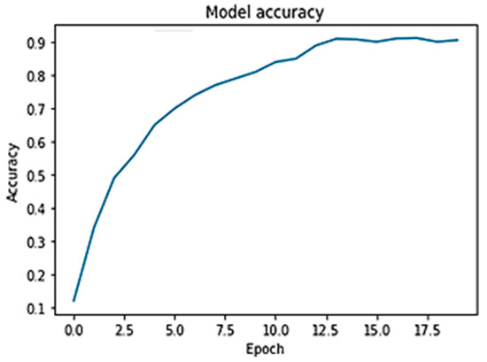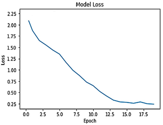 The next metric measured was the CNN’s training capability. The FPGA CNN was trained on 4587 images, with 1378 images used for testing and 937 for validation. The plots shown in Figure 19 and Figure 20 display the accuracy percentage over time and the model’s loss rate, respectively. Figure 19 illustrates an optimum progression in accuracy, confirming that the backpropagation algorithms operate as intended, even with applied approximations and quantization. After epoch 15, the model reaches saturation, and the loss no longer decreases, leading to the cessation of training. Each epoch takes 1.45 s to complete in the FPGA, resulting in a total training time of 1 min and 46 s to achieve 91.3% accuracy.