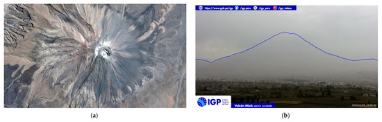 Optical remote sensing and spaceborne monitoring for the Misti Volcano. (a) Optical image of Misti Volcano obtained through the satellite PeruSat-1. Image taken from [5]. (b) Optical camera used for Misti Volcano Monitoring during the rainy season. Image taken from [6].