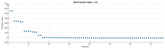 Additionally, Figure 10 shows the parameter of the initial design, where it can be observed that for a frequency of 433.25 MHz, the magnitude is −19.71 dB, with its lowest value at 435 MHz. This indicates the need to optimize the antenna parameters for .