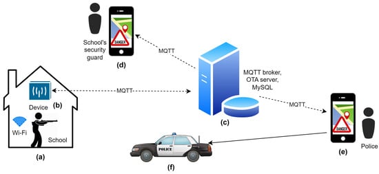 Figure 1. Crime scene (a) where the shooting happened. The gunshot detector device (b) is connected to the local Wi-Fi and the MQTT broker server (c) as a client. It detects gunshot sounds and sends notifications to smartphones of all MQTT clients such as the security guard (d) and police (e) using secured MQTT protocol. The police car (f) is dispatched.