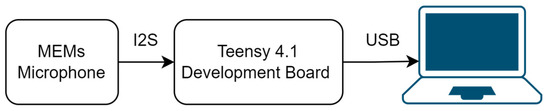 A custom recording device is designed and developed for this project and its hardware block diagram is shown in Figure 2. A miniature MEMS microphone [17] is interfaced with a Teensy 4.1 Development Board [18] using I2S protocol. The Teensy board contains an ARM Cortex-M7 processor running at 600 MHz, 7936K Flash, 1024K RAM, 2 I2S digital audio ports, USB, and other ports. Its USB port can operate in device or peripheral mode at 480 Mbit/s speed. The software enables bi-directional stereo audio streaming, and the board is recognized by the computer as a USB sound card. Using the Audio System Design Tool for Teensy Audio Library [19], firmware for the Teensy was generated to send I2S data from the microphone to the USB of the computer. The NCH WavePad version 17.44 [20] audio processing software was used in the computer for recording. Recordings were done at a 44.1 kHz sampling rate having a resolution of 32 bits in the mono channel mode.