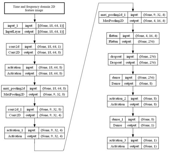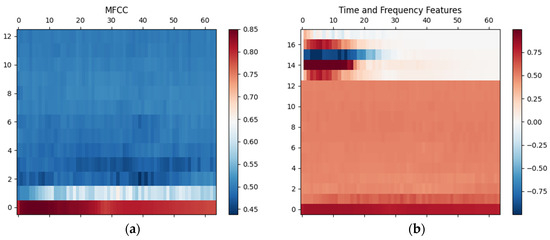 The time domain features and the frequency domain features are then stacked together and a 2D feature vector of 18 × 64 is generated as shown in Figure 4b. In Figure 4b, the rows from 0 to 12 are the frequency domain features and the rows from 13 to 17 are the five time domain features. After this transformation, the one-dimensional time-domain sound signal is converted into a two-dimensional matrix, similar to an image. By utilizing this image representation, image classification deep learning models, such as Convolutional Neural Networks (CNNs), can be applied for classification. A dataset of a total of 155,000 images is generated from the two classes of sound samples and used as input for the deep learning model during classification. The MFCC data and their corresponding class labels are randomly shuffled while maintaining the correct pairing between data and labels.