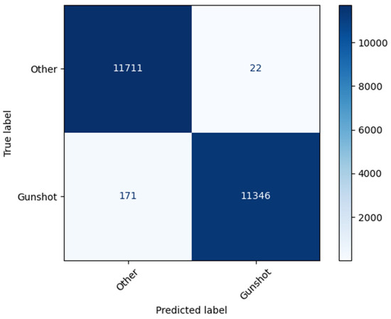 According to the Nyquist theorem [64], the sampling rate must be at least twice the highest frequency present in the signal to capture it accurately. Human hearing typically ranges from 20 Hz to 20,000 Hz, so a sampling rate of 44.1 kHz ensures that frequencies up to 22,050 Hz (just above human hearing) are captured without aliasing. The proposed system captures, records, and classifies gunshot and non-gunshot sounds, which might include sounds anywhere in the entire hearing frequency range. Thus, lowering the sampling rate may distort the signal and may lead to misclassification. If a low-resource microcontroller having limited RAM and speed is used, then it might be necessary to reduce the sampling rate and resolution, and compromise accuracy. However, the Raspberry Pi Zero 2W has sufficient RAM and processing speed to store 1 s of sound at a 44.1 kHz sampling rate with 32-bit resolution, which requires approximately 176.4 kB of memory for mono audio. With 512 MB of RAM and a 1 GHz quad-core processor, the device can handle these data efficiently without compromising accuracy or requiring a reduction in resolution. As future work, we plan to implement the device in low resource microcontroller and perform experiments with lower sampling rate and resolution.