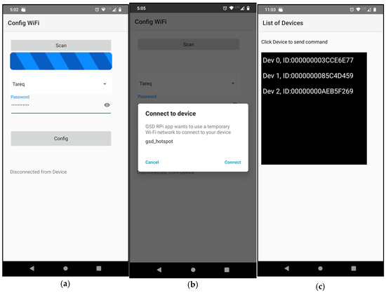 Figure 11. Screenshots of the smartphone app during Wi-Fi provisioning: (a) the app fills a combo box by scanning the nearby SSIDs, the user selects the SSID, and provides its password; (b) the app then confirms with the user to connect to the device’s hotspot (SSID: “gsd_hotspot”), it then transmits the SSID and password via a socket to the device; (c) once the device is connected to the Wi-Fi, it sends its <DeviceID> to the smartphone app and the device is added to a list.
