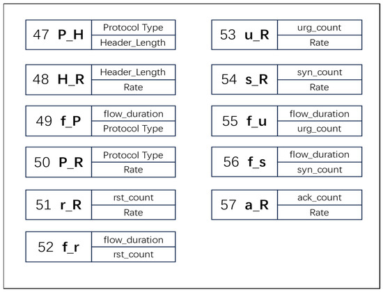 After analyzing the behavior patterns of LDDoS, the following features related to low-rate attack behaviors were considered from the original features of the dataset: flow duration (1, flow_duration): indicates the duration of the flow, used to identify long connections, which may indicate a DDoS attack or continuous data transmission; message header length (2, Header_Length): the length of the packet header, reflecting the protocol type and potential exploitation; protocol type (3, Protocol type): by analyzing the type of protocol used in the traffic, the nature of the communication can be inferred, such as HTTP, HTTPS or other IoT-related protocols; rate (5, Rate): the rate of the traffic, used to detect sudden traffic increases, which may be a sign of a network attack; the number of flags (15, ack_count, 16, syn_count, 17, fin_count, 18, urg_count, 19, rst_count): the number of flags used to identify different types of network scanning or session hijacking attacks. By combining the properties of these behaviors, a feature set is constructed. For these behavior-related features, feature polynomials are used to generate high-order terms of the original features and interaction terms between features to expand the feature space. By introducing feature polynomials, the nonlinear relationship between features and targets can be simulated, thereby improving the prediction ability of the model. Feature polynomials generate new features through power combinations between features, also known as interactive features.