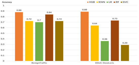 After training each model with the processed data of the selected feature set, the results shown in Table 4 are obtained. The results here are the results of detecting all types of attacks in the dataset, which can comprehensively demonstrate the overall detection performance of the model. Figure 6 shows the detection results of benign traffic and LDDoS alone. It can be seen that although other models recognize most of the attacks in the dataset compared to the model proposed in this paper, the recognition rate of benign traffic and LDDoS alone is not as high as the model proposed in this paper, among which the accuracy of random forest RF reached 0.94, the precision reached 0.94, the recall rate was 0.94, and the F1 score was 0.94; in the evaluation of support vector machine SVM, the accuracy reached 0.68, the precision reached 0.73, the recall rate was 0.67, and the F1 score was 0.64; the accuracy, precision, recall rate, and F1 score of K Nearest Neighbors (KNN) all reached 0.83; the accuracy, precision, and recall rate of the logistic regression algorithm LR all reached 0.65, and the F1 score was 0.62;