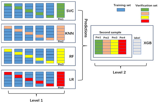 In the stacking model, we considered a variety of classifiers: support vector classifier (SVC), K-nearest neighbor (KNN), random forest (RF), logistic regression (LR), and XGBoost (XGB). SVC is good at handling nonlinear data and maps features to a higher dimensional space through kernel techniques to solve complex classification problems, but its performance is highly dependent on the choice of parameters. KNN is an instance-based learning method that does not require a traditional training phase, is suitable for multi-class problems, but its main challenges are high computational cost and large storage space requirements. RF can handle high-dimensional data well and has strong resistance to overfitting. LR is a simple and effective classification tool that is suitable for classification tasks, but due to its linear nature, it is prone to underfitting, resulting in low classification accuracy. XGB introduces an approximation algorithm that optimizes the enumeration process of all possible split points for each feature in the traditional gradient boosting decision tree, making it more efficient and flexible. Although XGB has no obvious weaknesses, it can also be sensitive to noise, so regularization techniques may be needed to avoid overfitting.