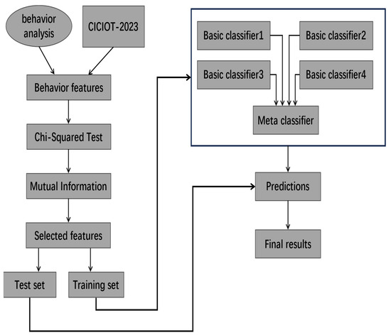 Figure 5 shows the model of our method, in which CICIOT-2023 is combined with the analysis of DDoS attack behavior to obtain behavior-based features to better detect LDDoS attacks. Not all selected features contribute, and chi-square filtering and mutual information methods are further used to screen out features with greater correlation; based on the selected features, the original data is divided into a training dataset and a test dataset and trained using a stacking model. In this process, the training data is first trained on each basic classifier, and the generalization ability of the model is evaluated using five-fold cross-validation.
