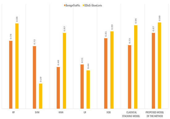 Figure 7 shows the detection of benign traffic (BenignTraffic) and low-speed DDoS attack traffic (DDoS-SlowLoris) by the model trained based on the behavioral feature dataset. The recognition rates of random forest RF for benign traffic and low-speed attack traffic are 0.78 and 0.98, respectively, and the recognition rates of support vector machine SVM for benign traffic and low-speed attack traffic are 0.72 and 0.29. The recognition rates of K Nearest Neighbors (KNN) for benign traffic and low-speed attack traffic are 0.48 and 0.87. The recognition rates of logistic regression algorithm LR for benign traffic and low-speed attack traffic are 0.51 and 0.44. The recognition rates of XGBoost for benign traffic and low-speed attack traffic are 0.81 and 0.89, while the recognition rates of traditional integrated algorithm model for benign traffic and low-speed attack traffic are 0.73 and 0.96. The recognition rates of the model in the method proposed in this paper for benign traffic and low-speed attack traffic are 0.87 and 0.99.