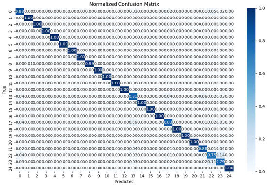 Figure 8 is the confusion matrix of the model, which does not include attack types with too few samples. Because the stacking model needs to encode the classification, we provide Table 5 to show the attack types corresponding to the encoding in the confusion matrix. In Figure 8, 0 represents benign traffic, and 8 represents DDoS-SlowLoris. The model can distinguish LDDoS from benign traffic very well. Among them, 99% of the test cases of LDDoS can be correctly identified, and 1% of the cases are identified as DDoS-ACK_Fragmentation numbered 1. This may be related to the dataset; the overall performance is also very good, and the recognition of other types of attacks also has good performance. The recognition ability of the model in numbers 13, 17, 21, 22, and 23 needs to be improved.