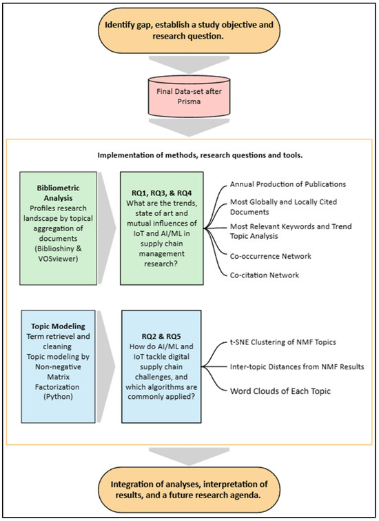 This section provides an overview of the data collection process, followed by a discussion of the techniques used for data analyses. For the purposes of this study, we used the Web of Science database, which offers comprehensive coverage of high-quality scholarly research, to collect our dataset. After obtaining the dataset, we conducted various types of bibliometric analyses, including descriptive, trend topic, and network analyses, to explore how IoT and AI technologies enhance supply chain operations. Additionally, we conducted topic modeling on the dataset to derive valuable insights that are not easily observed through traditional analyses. This combined approach provided a comprehensive perspective on the research field by combining quantitative and qualitative insights. While topic modeling adds a qualitative element by automatically detecting topics within huge datasets, bibliometric analysis provides an organized, quantitative overview of the development of a body of literature. This method minimizes researcher bias, ensures broad coverage of the field, and aids in recognizing influential works and emerging trends. These analyses addressed the research questions outlined in the previous section. Figure 1 provides a pictorial representation of the research method applied in this paper.