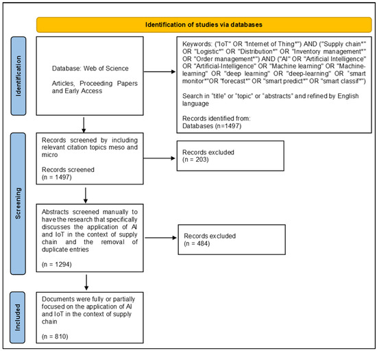 The screening stage was immediately followed by the inclusion stage, ensuring that our dataset consisted solely of papers addressing the application of AI and IoT within the supply chain context. This thorough process led to our final dataset, which comprised 810 documents [15].