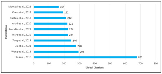 Figure 4 presents a chart displaying the papers with the highest numbers of global citations. Notably, Kusiak, 2018 [35] discusses the concept of the digitization of the supply chain as part of smart manufacturing through the application of IoT, cloud computing, service-oriented computing, artificial intelligence, and data science. Wang et al., 2018 [36] reviews the use of IoT, social networking, and crowdsourcing in supply chain operations and proposes machine learning models to process the large volumes of generated data. Liu et al., 2021 [30] examines how emerging technologies such as IoT, robotics, artificial intelligence, big data analytics, and blockchains improve the agri-food supply chain. Tang et al., 2019 [37] explores the strategic role of logistics and transportation services in creating economic, environmental, and social values through the adoption of new technologies. Saurabh et al., 2021 [32] studies the application of emerging information and communication technology in improving agri-food supply chain efficiency and quality management. Misra et al., 2022 [31] examines the role of IoT, big data, and artificial intelligence in shaping the future of agri-food systems and modernizing supply chains. These papers highlight the versatility of IoT and AI applications across supply chains in various industries. These technologies find utility in sectors ranging from agricultural supply chains to manufacturing supply chains and beyond.