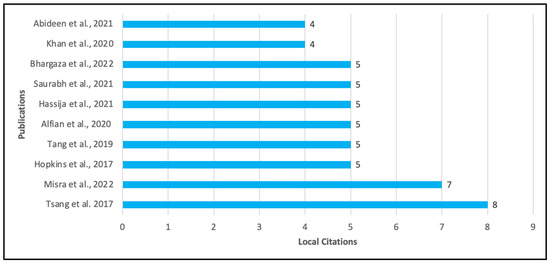 In terms of local citations, the paper by Tsang et al., 2018 [38], holds the highest ranking with eight citations. This paper proposes an IoT- and AI-based risk monitoring system (IoTRMS) for controlling product quality and occupational safety risks in cold chains. Following this, the paper by Misra et al., 2022 [31], ranks second in the list of most locally cited references, as depicted in Figure 5. The papers by Tang et al., 2019 [37]; Saurabh et al., 2021 [32]; Hopkins et al., 2018 [39]; Hassija et al., 2021 [40]; Bhargava et al., 2022 [41]; and Alfian et al., 2020 [42] follow next on the list, each with five citations. Hopkins et al., 2018 [39] documents the role and impact of big data analytics and IoT in supporting a large logistics firm’s strategy to improve drivers’ safety, lower operating costs, and reduce the environmental impact of their vehicles. Hassija et al., 2021 [40] discusses the application of emerging technologies, such as blockchains, ML, and physically unclonable functions (PUFs), to address vulnerabilities in supply chain infrastructure. Bhargava et al., 2022 [41] presents an Industrial Internet of Things model integrated with intelligent logistics and transportation management to optimize logistics, improve customer experience, and minimize transportation costs. Alfian et al., 2020 [42] discusses a food traceability system that utilizes RFID and IoT sensors for identifying and tracking perishable items, such as meat and dairy products, to safeguard safety and quality.