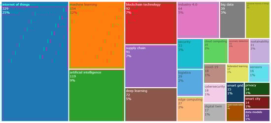 The terms “internet of things”, “supply chain”, “logistics”, “machine learning”, “artificial intelligence”, and “deep learning” were among the keywords in our main query, so they exhibit high frequency values in the tree map figure.