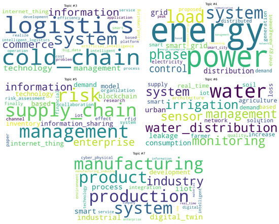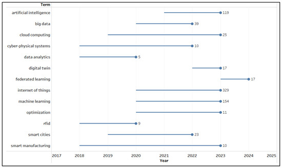 The results of the trend topic analysis not only confirm the findings from the tree map analysis but also provide new perspectives for future research. The recent rise of federated learning in the literature highlights the growing interest in leveraging machine learning techniques to address key challenges in IoT integration within supply chains, particularly around privacy, security, and data isolation. This underscores the significance of privacy and security as major concerns when applying IoT to supply chains. Additionally, areas such as smart cities and smart manufacturing are likely to face similar challenges. The analysis suggests that while smart manufacturing and cyber–physical systems remain central themes, newer concepts like digital twins and federated learning are gaining significant traction, indicating a shift toward more secure and decentralized technologies.