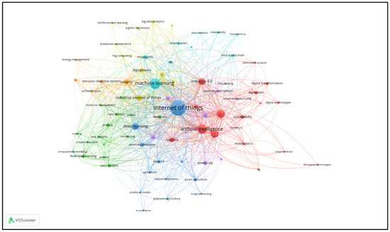 This section helps answer research question RQ 2, i.e., “What IoT strengths and weaknesses affect AI/ML positively or negatively in the studies?” Network visualization and co-occurrence network analysis have emerged as crucial subjects in the current academic landscape. Through these methods, researchers can evaluate the relationships among various entities, facilitating a comprehensive analysis of the connections between them [56]. The co-occurrence network of the authors’ keywords serves as a visual tool that interprets the interrelations among keywords utilized by authors to delineate their research findings. Keywords are deemed to co-occur if they are present in the same title, abstract, or citation context [57]. This network was constructed using VOSviewer, which assigns nodes to represent keywords and establishes connections between them based on their co-occurrence in publications. To ensure the network’s relevance, a minimum occurrence threshold of five was set, meaning that only keywords appearing in at least five distinct publications were included in the analysis. This criterion filtered out less common terms, emphasizing frequently used keywords and enhancing the network’s clarity and significance, resulting in a final count of 77 keywords, which was deemed optimal for visualizing well-defined clusters and identifying key trends. When the threshold was increased to 10 or more, the network diagram became significantly smaller, with smaller cluster sizes. Thus, the threshold of five was chosen to generate a network diagram with well-defined clusters and an ideal number of keywords.