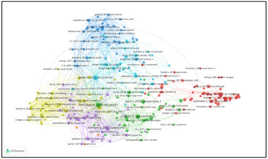 The red cluster highlights various advancements in machine learning and optimization algorithms. Ref. [91] introduces federated learning, a decentralized approach that collects locally computed updates to train models without centralizing sensitive data. This method overcomes challenges related to data privacy and quantity. Ref. [92] presents the Adam algorithm, an efficient optimization method for stochastic objective functions that adapts to varying gradients, demonstrating practical effectiveness and convergence properties. Refs. [93,94] highlight the efficacy of deep learning and neural networks in various applications like character recognition and data representation learning, emphasizing the success of convolutional neural networks in image processing and the ability of deep learning models to understand complex structures in large datasets, improving tasks such as speech recognition and object detection. Ref. [95] addresses security challenges in IoT systems, suggesting the bot–IoT dataset for training intrusion detection systems and stressing the importance of realistic datasets for effective system development and evaluation in the face of evolving cyber threats. Ref. [96] discusses the significance of big data and digital twin technologies in advancing smart manufacturing, underlining the role of data intelligence and cyber–physical integration in improving various manufacturing processes, from product design to predictive maintenance. The authors highlight the integration of big data analytics and digital twins as a key strategy for promoting smart manufacturing. The papers in this cluster collectively showcase ongoing research and development in machine learning, optimization algorithms, deep learning, IoT security, and smart manufacturing, emphasizing the importance of innovative approaches in tackling contemporary challenges and propelling technological advancements in diverse domains.