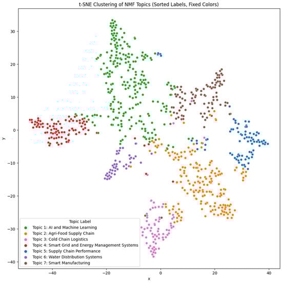 Figure 10 displays our topic modeling outputs for the NMF technique visualized using t-SNE. Each data point in the figure represents a scientific publication from the dataset [102]. T-SNE is a visualization technique for high-dimensional data, assigning each data point a position on a two or three-dimensional map [103]. It is an improved version of Stochastic Neighbor Embedding [104], offering enhanced visualizations by preventing points from clustering in the map’s center. A clear comparison between the t-SNE graphs of NMF and LDA reveals the superior performance of NMF in topic modeling over LDA. Particularly noteworthy was the reduced overlap and increased prominence of clusters in the NMF analysis. Consequently, we opted for the topic modeling results derived from the NMF algorithm. When applied to NMF topics specifically, t-SNE clustering facilitates the exploration of relationships and similarities among the topics. By reducing the dimensionality of the topic representations derived from NMF, t-SNE creates a visual representation that groups together topics with similar characteristics in close proximity.