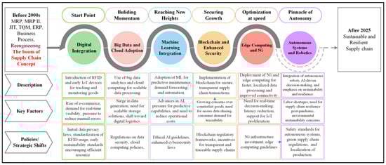 The red cluster is primarily centered around keywords such as “supply chain”, “industry 4.0”, and “digital technologies”, indicating a focus on the digitalization of the supply chain through the application of Industry 4.0 technologies. The evolution of industry and technology has progressed rapidly through several revolutionary phases, each bringing significant advancements in SCM processes. Ref. [58] outlines the progression from the First Industrial Revolution, marked by the steam engine to Industry 4.0, characterized by the convergence of physical, digital, and biological spheres. Beyond Industry 4.0, the emergence of Industry 5.0 is notable, emphasizing personalized manufacturing and human–machine collaboration. Ref. [59] identifies crucial enablers of Industry 5.0, including AI, big data, digital transformation, ML, and IoT, reshaping sectors such as manufacturing and supply chains. Ref. [60] highlights how IoT, AI, robotics, and advanced computing challenge traditional approaches in pharmaceutical production. In the post-COVID-19 era, there is a growing emphasis on leveraging these technologies for socially responsible operations. Ref. [61] proposes a framework that integrates Industry 4.0 technologies with socially responsible operational performance, identifying seven transformational technologies to enhance organizational and community social performance. Additionally, the circular economy (CE) gains importance in post-pandemic recovery. Ref. [62] suggests evaluating CE implementation through “non-market-based environmental goods valuation methods” and improving performance measurement using a digital technology ecosystem involving multiple stakeholders. This integration of advanced technologies with sustainability and social responsibility signifies the next phase in industrial evolution, promising more efficient, flexible, and responsible supply chain operations.