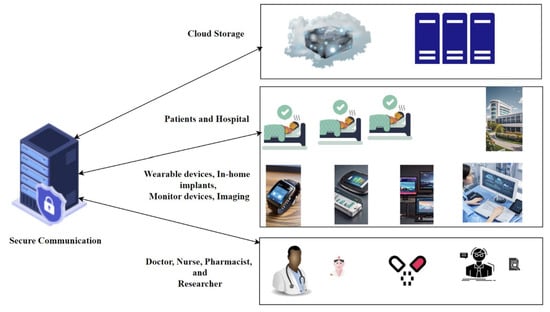 - Data Storage: The cloud server is responsible for securely storing large quantities of patient data from various sources within the ecosystem. This encompasses essential physiological indicators obtained from IoT wearable devices, measurements from home medical equipment, and pertinent clinical data extracted from hospitals and clinics, such as Electronic Health Records (EHRs) [20,21]. To accommodate this large data volume, strong security measures are essential to safeguard patient confidentiality and adhere to regulations such as HIPAA in the USA or the Data Protection Act in the UK.