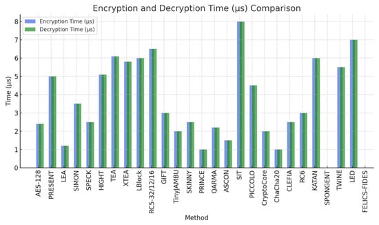 - Encryption Time (µs): The duration required to perform encryption, measured in microseconds.