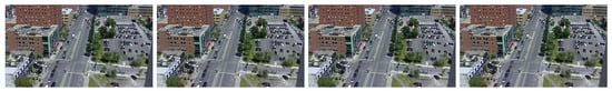 - Outdoor Video 1 (): The first outdoor video corresponds to the René Lévesque video from Urbantracker [19]. It captures video an office building, offering a view of three intersections and containing about 20 objects per scene simultaneously. The resolution of the video is , consisting of a total of 1000 frames encoded using the codec at 30 Frames Per Second (fps) with a Variable Bit Rate (VBR).