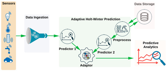 This study concentrates on IoT time series data forecasting models because specific applications require both rapidity and accuracy, necessitating highly precise predictions within short timeframes [10,11]. We introduce an innovative adaptive technique founded on the Holt–Winters forecasting model, namely “AHW”. This approach seeks to predict a spectrum of values by analyzing historical trends and identifying the most relevant patterns from previous data points. It combines these extracted similar data windows with the Holt–Winters model to create and train a forecasting system that includes past information. AHW aims to achieve high forecasting accuracy and minimize the time required for prediction processes.