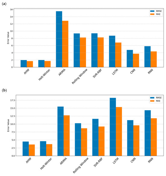 In our experiment, we chose the temperature feature that presented the most diverse range of data. We used a window size of 48 for the monthly forecasting dataset and 365 for the daily forecasting dataset. The monthly forecasting level yielded RMSE/MAE values of 1.9475/1.6849 for AHW, 1.9768/1.6935 for HW, 15.5199/12.8402 for ARIMA, 9.3381/8.2183 for RW (window size = 3), 9.3731/8.2422 for SVR-RBF, 8.7299/6.8039 for LSTM, 4.7751/3.7358 for CNN, and 5.8109/4.3654 for RNN as displayed in Figure 2a. For the daily dataset, the RMSE/MAE results were 4.4756/3.5597 for AHW, 4.5802/3.6736 for HW, 15.4917/12.7306 for ARIMA, 10.2243/8.6567 for RW (window size = 30), 11.6265/9.2091 for SVR-RBF, 18.2412/15.3383 for LSTM, 11.1932/9.5714 for CNN, and 14.3404/11.8075 for RNN as illustrated in Figure 2b.