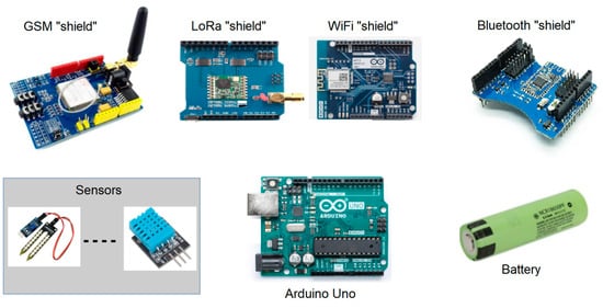 The hardware parts of an Arduino-based end-node. The top part shows the alternative boards for creating the network. Such boards, mounted directly onto an Arduino (or compatible) microcontroller board to expand its functionality, are called Arduino “shields”.