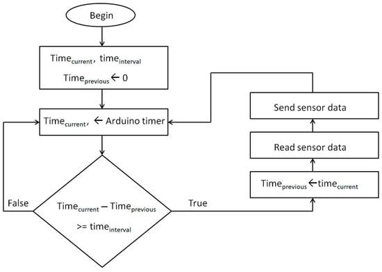 Let us now discuss the abstraction of the code running in the Arduino (i.e., the firmware). Presenting the firmware as plain source code would serve little purpose, as students lack the background to interpret or understand it meaningfully. However, it is common practice in introductory Computer Science courses to use flowcharts as a way to visualize logical structures []. Figure 4 presents an abstract flowchart illustrating the logic implemented in the firmware. The core structure is an infinite loop, within which data is transmitted to the central station at predefined time intervals. This is achieved by checking whether the elapsed time since the last transmission exceeds the time interval. Whether this abstract flowchart is shown to students depends on the extent to which basic algorithmic concepts are included in the specific course curriculum.