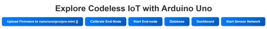 Figure 5 shows the buttons available to the students. The leftmost button is used for uploading the firmware to the Arduino wired to the student’s computer, transforming the Arduino into an end-node. Moving to the right, we see the button used to calibrate the end-node. Next to it is the “Start” button, which instructs the end-node to begin sending data to the central station. This function is used in both Isolated Node Mode and Lab Network Mode, where each student is responsible for one sensor. The “Database” button allows for writing SQL queries, and the “Dashboard” allows for plotting the stored data. Finally, the “Start Sensor Network” button initiates Field Deployment Mode. In this mode, the central station sends a command to all end-nodes connected to the computer. Once commanded, each end-node begins sending its data, which the central station then collects. Let us now explain the functionality of each button in more detail.