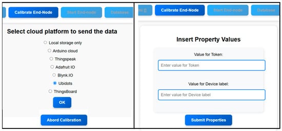 The leftmost button requires no action from the student other than connecting the Arduino to the computer via a USB cable. A single click uploads the firmware to the Arduino, transforming it into an end-node. To use the calibration button, the student must again connect the end-node to the computer via USB and complete a series of configuration steps. The first step involves selecting the target IoT platform to which the server will forward the data, or choosing the “local storage only” option (see Figure 6). If an IoT platform is selected, the student must then provide the necessary parameters to ensure successful data transmission.