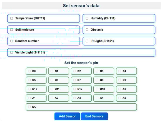 The next step is to define the sensors connected to the Arduino. For each type of physical measure (e.g., temperature, humidity) provided by a sensor, the user must specify the Arduino pin to which the corresponding sensor is connected. The interface for entering this information is shown in Figure 8. To ensure compatibility with the virtual device shown in Figure 7, i.e., to send data labeled as “random_number”, the student must check the “Random number” option in Figure 8. The “Random number” option simulates a sensor by generating test values and can be used for experimentation or in cases where a real sensor is not available.