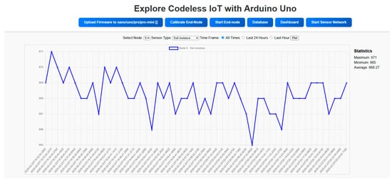As previously mentioned, the data is stored locally on the server side. Through a built-in dashboard (see Figure 9), students can visualize the data from a selected node and specific attribute over a chosen time range (including all data, the last 24 h, or the last hour). This capability ensures that the educational scenarios remain fully functional even without the use of cloud platforms, which is particularly important in field settings where Internet access may not be available. In this context, our platform embraces the principles of edge computing, as data is processed and analyzed locally on the central station without reliance on external servers. This not only improves responsiveness but also introduces students to a computing paradigm that is increasingly important in modern IoT deployments.