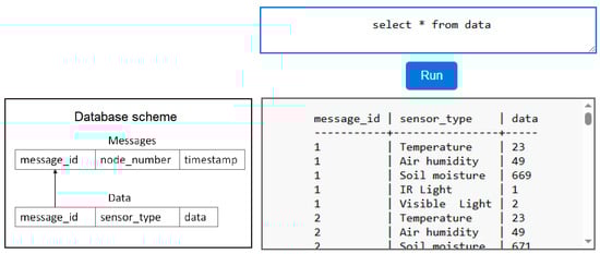 The database scheme is simple and shown on the left part of Figure 10. The “Database” button in the main menu allows for writing SQL queries, as shown on the right part of Figure 10.