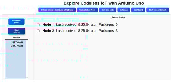 Finally, the “Start Network” button in the main menu enables students to initiate and monitor the wireless sensor network from a single web interface. As illustrated in Figure 11, this feature provides a real-time overview of the network’s operation. It allows users to observe connected nodes and incoming data streams in a consolidated and user-friendly environment. For this network to start, all end-nodes must be connected to the same computer—a requirement that characterizes the “Field Deployment Mode” educational scenario. The student adds end-nodes to the network one by one by clicking the “Insert End-Node” button. Each end-node appears in a list on the left side of Figure 11, initially labeled as “unknown” since communication has not yet begun and the central station has not received the nodes’ identifying information. Once all end-nodes have been inserted, the student clicks the “Start Network” button to begin data transmission. The central area of the screen displays real-time information for each node that sends data. Specifically, for every active node, students can see its name, the timestamp of the most recent data packet received, and the total number of data packets transmitted. For example, in Figure 11, the network currently consists of two end-nodes, named “Node 1” and “Node 2.”