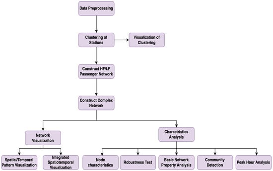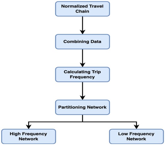 Step 4—Network Hierarchization: The network is subdivided into two sub-networks based on the travel frequency of passengers: high-frequency and low-frequency. This division allows for a more precise analysis and comparison of the travel patterns of different passenger groups, revealing their impact on the structure and fluidity of the public transportation network.