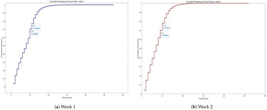 Figure 3 illustrates these findings, where the X-axis represents the number of trips (i.e., individual travel counts per passenger), and the Y-axis represents the cumulative proportion of passengers—that is, the proportion of all users whose travel frequency is less than or equal to the corresponding value on the X-axis. This cumulative distribution helps to reveal the skewness in passenger travel behavior and serves as the basis for selecting a threshold to distinguish between high- and low-frequency travelers.