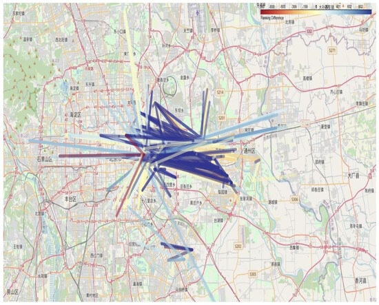 To gain a deeper understanding of the travel preferences of high- and low-frequency passengers and their impact on the transportation network, the top 1000 OD (origin-destination) pairs for each passenger group were ranked and compared. The rankings for these OD pairs were calculated separately for high-frequency and low-frequency passenger networks during peak and off-peak periods. Subsequently, the ranking differences were determined by subtracting the low-frequency ranking from the high-frequency ranking. For example, if a route ranks first in the high-frequency network but 1000th in the low-frequency network, the difference is –999. If an OD pair is absent in the low-frequency network, its ranking difference is assigned a value of –1000.