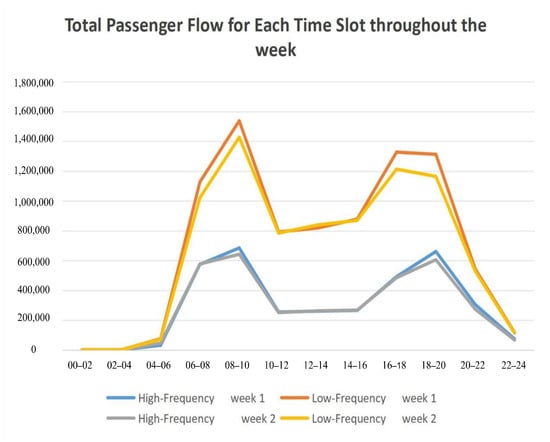 The described method allows for recording the total number of card swipes within each time slot, providing a detailed view of passenger activity during specific periods. By further aggregating the number of swipes across all days of the week for each time slot, the total passenger flow for each time slot throughout the entire week can be determined. This aggregation provides a comprehensive dataset for analyzing weekly travel patterns and identifying peak usage periods. The summarized results are presented in