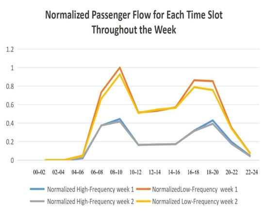 Step 3—Normalization of Flow: Given the varying numbers of passengers in the high and low-frequency networks, max–min normalization is applied to ensure the comparability of station-to-station flow across networks. This technique scales all flow values to a unified range between 0 and 1, preserving the relative position of each value within the maximum and minimum flow values. The specific method for this normalization is presented in Formula (1).