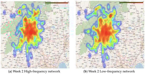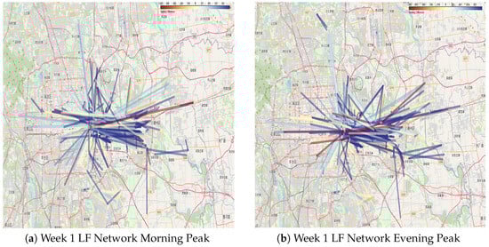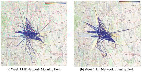 Step 5—Dividing High and Low Frequency Passenger Networks: In the absence of a clear natural boundary in cumulative travel frequencies, a threshold of approximately 25% was selected. Passengers with the highest 25% of travel frequencies were classified as high-frequency passengers, while the rest were categorized as low-frequency passengers. Passengers traveling 11 or more times in the first week and 10 or more times in the second week were designated as high-frequency, while all others were classified as low-frequency. The resulting high- and low-frequency passenger networks are presented in