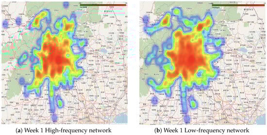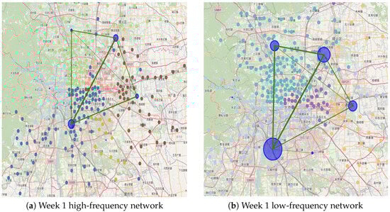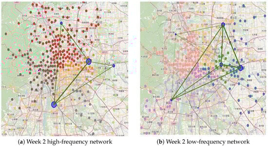 In the visualization map of the high- and low-frequency passenger networks during the first week, the distribution and connections between central nodes appear similar. However, in the second week, the high-frequency passenger network exhibits larger communities with more stations within each community, whereas the low-frequency passenger network has a greater number of communities with more distinct divisions and closer internal connections.