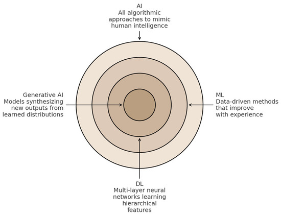 Narrow AI can also be called Artificial Narrow Intelligence (ANI) or weak AI. ANI utilizes ML, Natural Language Processing (NLP), and DL via advanced variations in algorithms made up of Neural Networks (NNs) to complete specified tasks [43,44,45]. Some examples of narrow AI include self-driving cars, which rely on computer vision algorithms, and AI virtual assistants. Artificial General Intelligence (AGI), also called general AI or strong AI, refers to a form of AI that can learn independently, think, and perform a wide range of tasks at a human level. The ultimate goal of AGI is to create machines capable of versatile, human-like intelligence, functioning as highly adaptable assistants (AI Agents) in everyday life. Generative AI is a form of AGI [46,47,48]. Figure 3 illustrates generative AI with respect to AI, DL, and ML