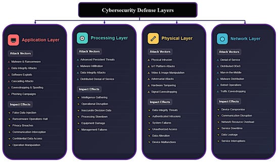 IoT systems that incorporate video are vulnerable to motion-based video assaults. These assaults utilize spatiotemporal attention networks to generate subtle disturbances that are difficult for human observers to detect [69]. In IoT-based smart grids, adversarial attacks can corrupt text data processed by NLP technology. These attacks can alter sentence-level data, misleading classification algorithms without significantly changing the semantic meaning [70]. Figure 7 shows a summary of cybersecurity threats on different layers of AIoT devices [71,72,73,74,75,76,77,78,79,80].